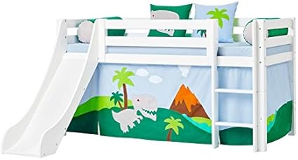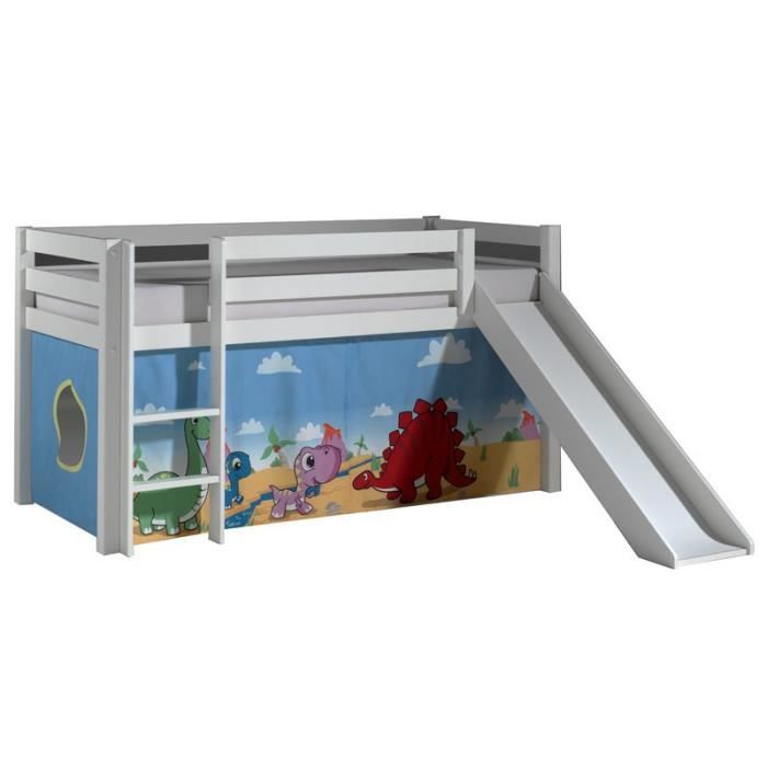 Lit Mezzanine Blanc Avec Toboggan Et Rideau Dinosaures Vert Et Beige 90x190 Cm Lestendances Fr