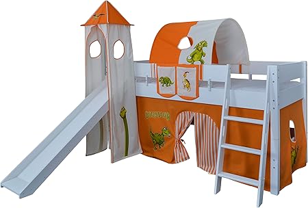 Lit Mezzanine Avec Toboggan Blanc Bois De Hetre Massif Lit D Enfant Avec Toboggan Tunnel Tour Et Rideau 90 X 200 Cm Orange Dino Amazon Fr Cuisine Maison